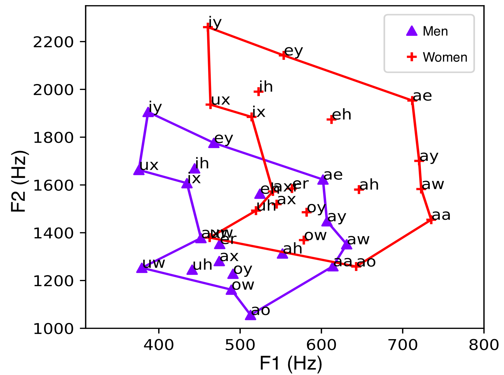 To provide a more comprehensive view, the figure below visualizes the average values for F1 and F2 in men and women for different vowels [4].