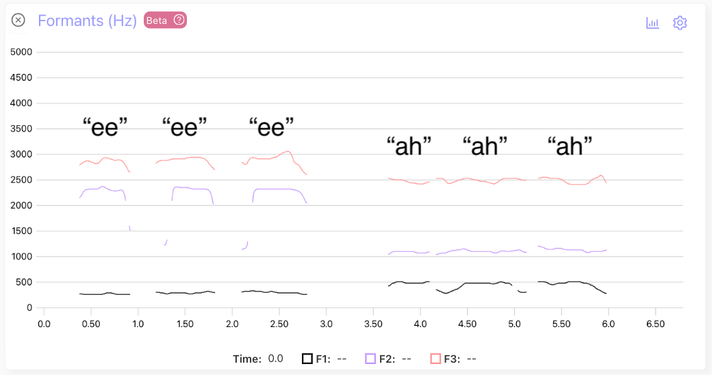 However, while the values of F1, F2, and F3 are generally lower in men compared to women, their value is also impacted by the words being spoken. Speech researchers often analyze formants in the context of vowels, as different vowels have different formant frequencies. For example, the F2 formant of the sound “ee” is higher than the sound “ah”, which is expected because the position of the tongue and jaw lead to a larger vocal tract when you say “ah” compared to “ee”. The image below is an example screenshot of the formants when saying “ee” and “ah”.