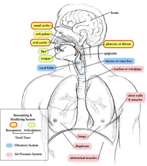 The diagram below highlights the major anatomical components that influence your speech production. One of the first steps in voice training is understanding each component, how they contribute to your voice, and learning how to control the ones that influence the perceived gender of your voice. That last part can be tricky because most components are controlled subconsciously.
